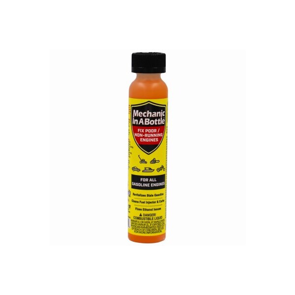 Mechanic In A Bottle 4 oz. Small Engine Additive is a clear liquid that cleans engines with issues related to varnished carburetors water in the tank carbon deposits ethanol and old/poor quality gas. It removes all varnish in the fuel system without having to remove the carburetor from the machine. It contains rubber and plastic conditioners revitalizes old fuel safely dissolves varnish/shellac and is an anti-corrosive/metal deactivator. It is also a carbon cleaner octane improvement fuel stabilizer high temperature detergent and upper cylinder lubricity. It is not a replacement for 2 cycle oil.