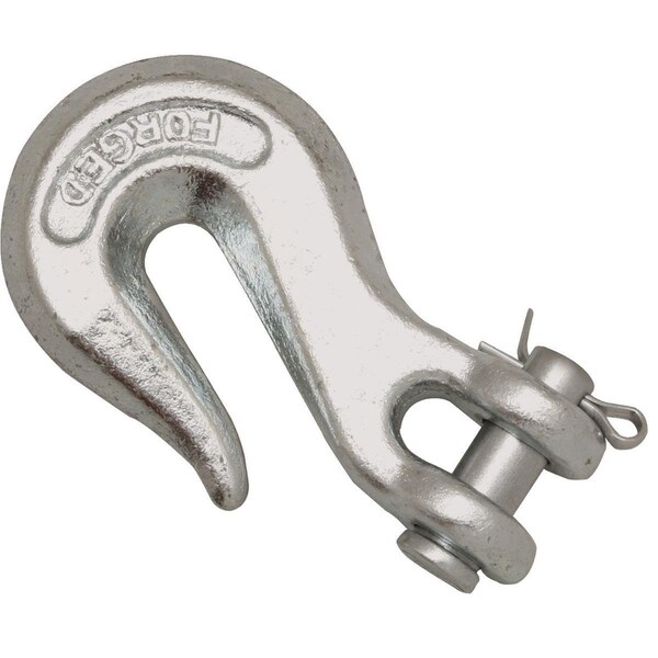 Create a custom chain assembly using this professional-grade, heavy-duty 40 grade chain hook. This hook is ideal for grabbing a single link of chain to form a loop for dragging, towing or pulling. This forged, carbon steel hook is zinc-plated and includes a clevis pin and cotter attachment. See chart below for hook capacities.