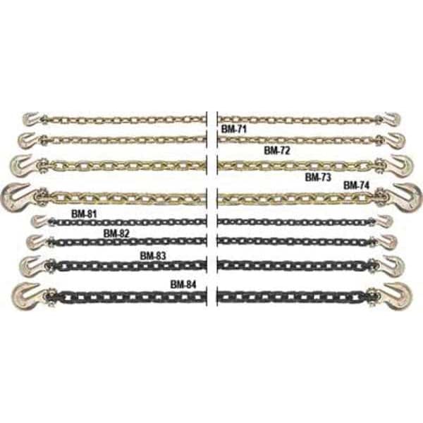 Straight Chain, Chain Type Transport Chain, Material Steel, Lifting Capability Not for Lifting, Working Load Limit 6,600 lb, Chain Grade 70, Trade Size 3/8 in, Link Type Straight, Overall Length 20 ft, Links per Foot 9, Includes Hook Hook Included, Hook Type Included Grab Hook, Finish Yellow Zinc, Welding Type Welded, Standards DOT