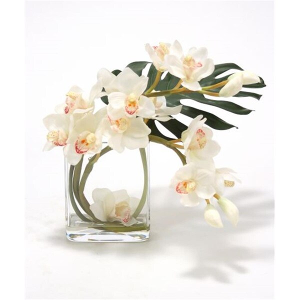 Waterlook White Orchid Arrangement with Split Philo Leaf in Curved Rectangular Glass Vase