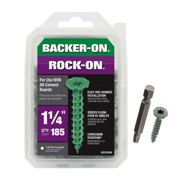 Backer-On Rock-On 1-1/4 in. cement board screws are designed for attaching Hardie Backer or equivalent fiber cement backer board to wood or light gauge steel studs. Backer-On Rock-On's patented serrated head design countersinks for flush seating at any angle, providing a smooth surface for tile. The Star drive recess with T-25 bit provides Stikfit for 1-handed installation. Backer-On Rock-On screws feature a Climacoat corrosion-resistant finish that prevents rust from bleeding into the grout and are perfect for use in high-moisture areas such as baths, showers, countertops, and floors. Conforms to ANSI A108.11 for cement board attachment. Backer-On Rock-On screws can be installed with a standard impact or drill/driver and product) for cement board fastening done right.