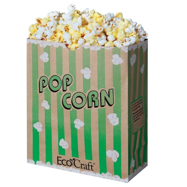 The EcoCraft Theater Popcorn Bag features a natural base color with green stripe accents and colorful upscale process print graphics. Made from grease-resistant, two-ply paper, this 130 oz. bag is designed to keep butter contained while providing a durable and economical alternative to cartons and tubs. Ideal for serving popcorn at theaters, concessions, or events, it combines practical construction with attractive design to enhance product presentation and functionality, available in a pack of 500.