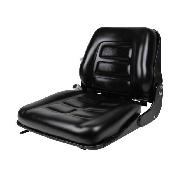 Back Suspension Seat. Features back angle adjustments, suspension weight adjustments, slides, seamless black vinyl, and a Operator Presence Safety switch.