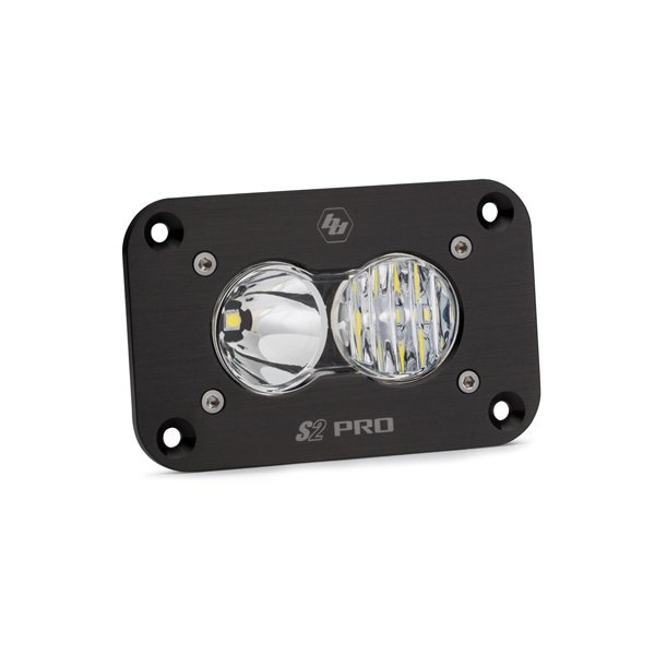 The S2 Pro LED Light offers an incredible 2,450 lumens out of a tiny 3 x 2in housing; the S2 Pro is quite literally the brightest LED light ounce for ounce on the market. The S2 Pro can be mounted where traditional lights would never fit. Moreover, it only draws 21 watts so your electrical system will barely know its there. This LED is perfect for all your adventures! Light Pattern:Driving/Combo: Maximum trail coverage in a single light. The Driving/Combo pattern is equipped with both Wide Driving, 42 degree, and the spot, 6 degree, optics to provide you with a smooth blend of light for both near field applications and distance, Lighting Zone 3Baja Designs Features:uService Replaceable Lenses And OpticsClearView All The Light, Right Where You Need It.MoistureBlock Waterproof, Rain Proof, SubmersibleCopperDrive Only LED Driven At 100 percent5000K Daylight Less Driver Fatigue, Natural ColorSpecifications:Lumens: 2,450 Utilizing 2 LEDsWattage/Amps: 20W / 1.66ADimensions: 2.93 x 1.76 x 1.68inWeight: 8 ouncesLED Life Expectancy: 49,930 HoursFront Lens: Hard Coated PolycarbonateHousing: Hard Anodized and Powder Coated Cast AluminumBezel: Billet Machined AluminumHardware and Bracket Material: Stainless SteelExceeds MIL-STD810G, Mil-Spec TestingBuilt-In Overvoltage ProtectionIP69K, Waterproof up to 9ft and Pressure WashableIK10 Compliant, Mechanical Impact TestingIncludes:S2 Pro LED Light Mounting Bracket