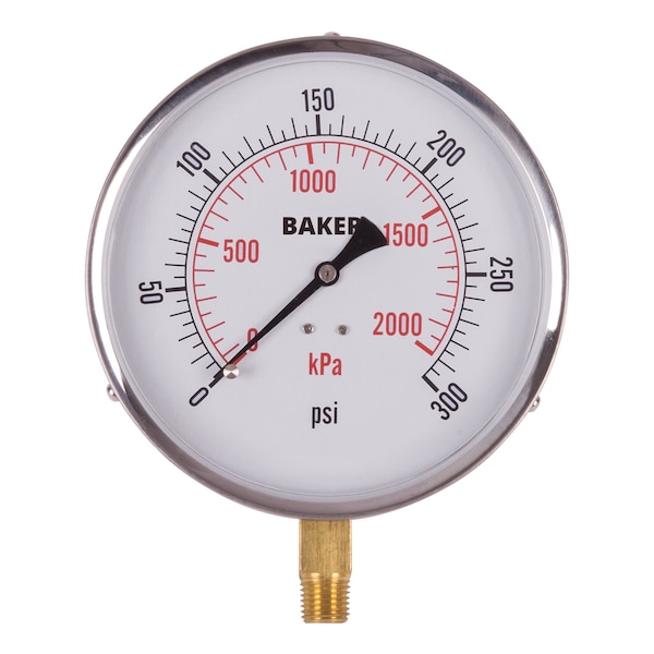 This pressure gauge has a 4.5" diameter dial and is corrosive resistant with its stainless steel case and ring. It measures 0-300 psi/0-2100 kPa.