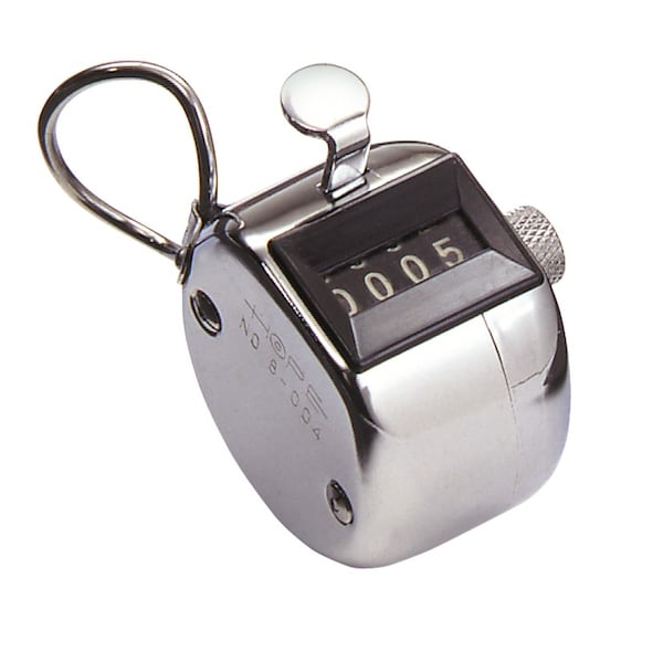 Sturdy 4-figure hand-operated reset counter with push button actuator and handy thumb ring for easy operation.