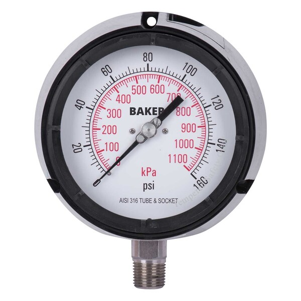 This pressure gauge features a 4-1/2" diameter dial and a 1/4" NPT male bottom connection. 0-160 psi/0-1100 kPa.
