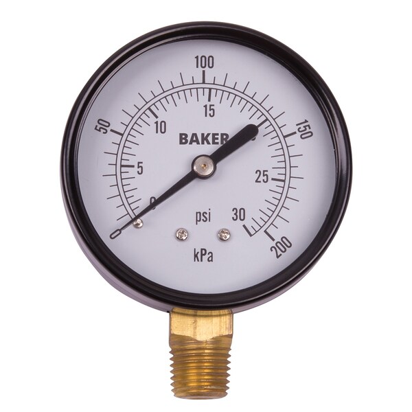 This pressure gauge features a 2.5" diameter dial and a 1/4" NPT bottom connection only. 0-30 psi/0-200 kPa