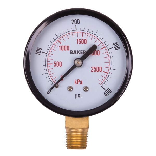 This pressure gauge features a 2.5" diameter dial and a 1/4" NPT bottom connection only. 0-400 psi/0-2800 kPa