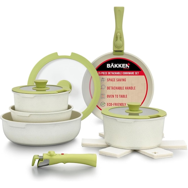 Bakken 15-Piece Non-Stick Cookware Set with Detachable Handles, Granite Stackable Pots and Pans