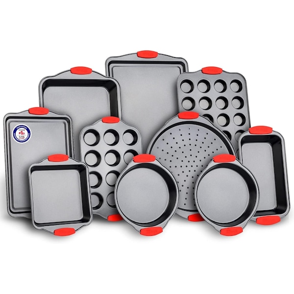 10-Piece Baking Set, Non-Stick Blue Coating, Carbon Steel, Red Silicone Handles, PFOA-Free