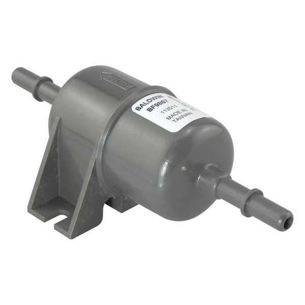 Fuel Filter, Filter Design In-Line, In-Line Fuel Filter, Height 5 1/2 in, Length 6 15/16 in, Width 4 in, Inlet 3/8 in, Outlet 3/8 in, Outside Dia. 3 5/16 in, Includes (2) Plastic Clips, Thread Size Not Applicable