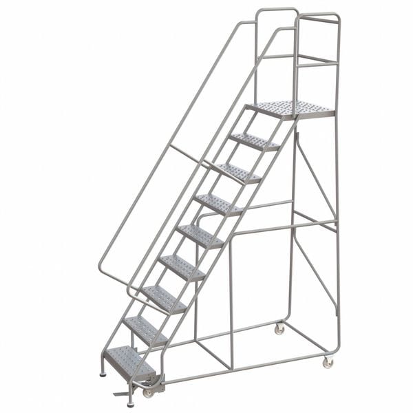 Rolling Ladder, Material Aluminum, Platform Height 7.5 ft, Handrails Included Yes, Handrail Height 2.5 ft, Overall Height 10.2 ft, Number of Steps 9, Assembled, Load Capacity 350 lb, Step Tread Perforated, Platform Depth 21 in, Platform Width 24 in, Bottom Width 36 in, Base Depth 72 in, Climbing Angle 56 Degrees , Step Depth 7 in, Step Width 24 in, Ladder Actuation Foot Activated Step Lock, Color Gray, Rear Exit No