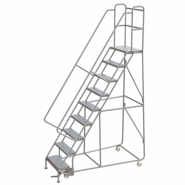 Rolling Ladder, Material Aluminum, Platform Height 7.5 ft, Handrails Included Yes, Handrail Height 2.5 ft, Overall Height 10.2 ft, Number of Steps 9, Assembled, Load Capacity 350 lb, Step Tread Perforated, Platform Depth 14 in, Platform Width 24 in, Bottom Width 36 in, Base Depth 72 in, Climbing Angle 56 Degrees , Step Depth 7 in, Step Width 24 in, Ladder Actuation Foot Activated Step Lock, Color Gray, Rear Exit No