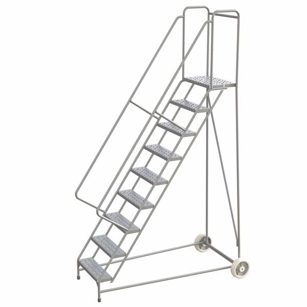 Wheelbarrow Ladder, Material Aluminum, Platform Height 7.5 ft, Handrails Included Yes, Handrail Height 2.5 ft, Overall Height 10.2 ft, Number of Steps 9, Assembled, Load Capacity 350 lb, Step Tread Perforated, Platform Depth 14 in, Platform Width 24 in, Bottom Width 37 in, Base Depth 76 1/2 in, Climbing Angle 56 Degrees , Step Depth 7 in, Step Width 24 in, Ladder Actuation Tilt and Roll, Color Gray, Rear Exit No