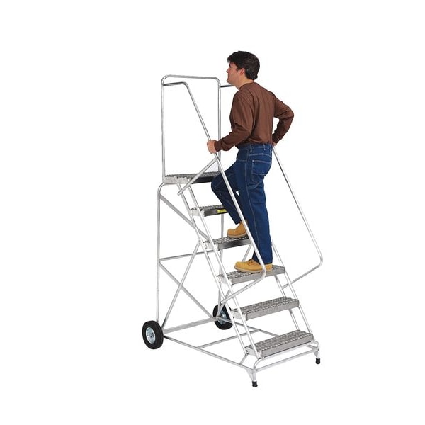 Wheelbarrow Ladder, Material Aluminum, Platform Height 5.8 ft, Handrails Included Yes, Handrail Height 2.5 ft, Overall Height 8.6 ft, Number of Steps 7, Assembled, Load Capacity 300 lb, Step Tread Ribbed, Platform Depth 14 in, Platform Width 18 in, Bottom Width 30 in, Base Depth 60 in, Overall Width 30 in, Climbing Angle 59 Degrees , Step Depth 7 in, Step Width 18 in, Ladder Actuation None, Finish Unfinished, Color Gray, Standards ANSI, OSHA Compliant