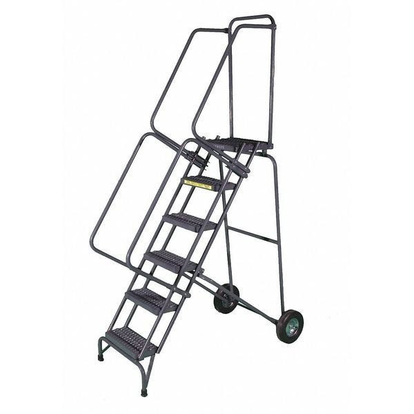 Folding Rolling Ladder, Material Steel, Platform Height 5.8 ft, Handrails Included Yes, Handrail Height 2.5 ft, Overall Height 8.6 ft, Number of Steps 7, Unassembled, Load Capacity 350 lb, Step Tread Perforated, Platform Depth 14 in, Platform Width 16 in, Bottom Width 30 in, Base Depth 58 in, Overall Width 30 in, Climbing Angle 59 Degrees , Step Depth 7 in, Step Width 16 in, Ladder Actuation None, Finish Powder Coated, Color Gray, Standards ANSI, OSHA Compliant