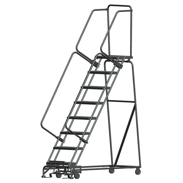 Rolling Ladder, Material Steel, Platform Height 6.7 ft, Handrails Included Yes, Handrail Height 2.5 ft, Overall Height 9.4 ft, Number of Steps 8, Unassembled, Load Capacity 450 lb, Step Tread Serrated, Platform Depth 14 in, Platform Width 24 in, Bottom Width 32 in, Base Depth 61 in, Overall Width 32 in, Climbing Angle 59 Degrees , Step Depth 7 in, Step Width 24 in, Ladder Actuation Weight Activated Step Lock, Finish Powder Coated, Color Gray, Standards ANSI, OSHA Compliant