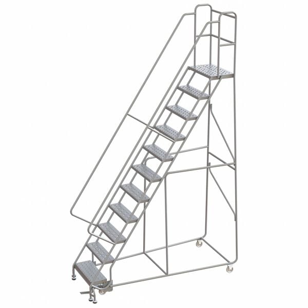 Rolling Ladder, Material Aluminum, Platform Height 9.2 ft, Handrails Included Yes, Handrail Height 2.5 ft, Overall Height 11.8 ft, Number of Steps 11, Assembled, Load Capacity 350 lb, Step Tread Perforated, Platform Depth 14 in, Platform Width 24 in, Bottom Width 38 in, Base Depth 86 in, Climbing Angle 56 Degrees , Step Depth 7 in, Step Width 24 in, Ladder Actuation Foot Activated Step Lock, Color Gray, Rear Exit No