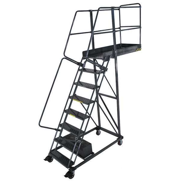 Material Steel, Platform Height 6.7 ft, Handrails Included Yes, Handrail Height 3.5 ft, Overall Height 10.2 ft, Number of Steps 8, Unassembled, Load Capacity 300 lb, Step Tread Perforated, Platform Depth 35 in, Platform Width 24 in, Bottom Width 32 in, Base Depth 58 in, Overall Width 32 In., Climbing Angle 59 Degrees , Step Depth 7 in, Step Width 24 in, Ladder Actuation Locking Casters, Finish Powder Coated, Color Gray, Standards ANSI 14.7, Manufacturers Warranty Length 1 yr