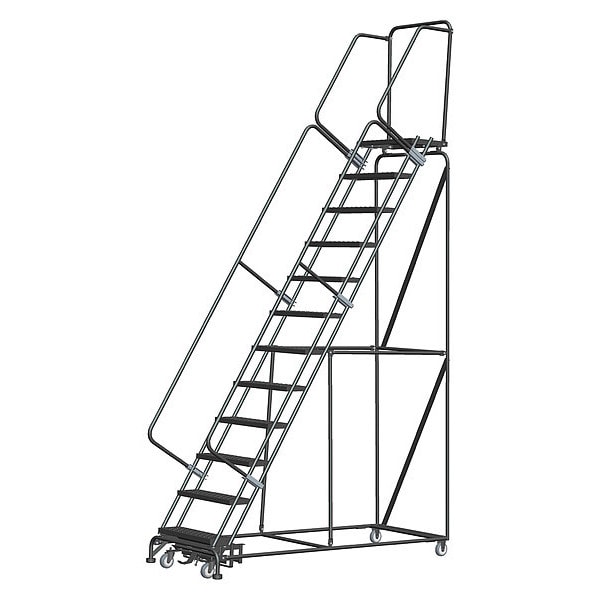 Rolling Ladder, Material Steel, Platform Height 10 ft, Handrails Included Yes, Handrail Height 2.5 ft, Overall Height 12.8 ft, Number of Steps 12, Assembled, Load Capacity 450 lb, Step Tread Serrated, Platform Depth 14 in, Platform Width 24 in, Bottom Width 32 in, Base Depth 87 in, Overall Width 32 in, Climbing Angle 59 Degrees , Step Depth 7 in, Step Width 24 in, Ladder Actuation Weight Activated Step Lock, Finish Powder Coated, Color Gray, Standards ANSI, OSHA Compliant