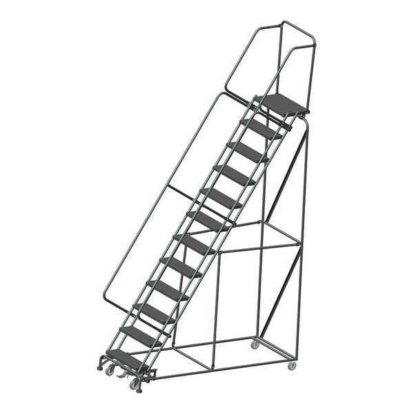 Rolling Ladder, Material Steel, Platform Height 10 ft, Handrails Included Yes, Handrail Height 2.5 ft, Overall Height 12.8 ft, Number of Steps 12, Assembled, Load Capacity 450 lb, Step Tread Perforated, Platform Depth 14 in, Platform Width 24 in, Bottom Width 32 in, Base Depth 87 in, Overall Width 32 in, Climbing Angle 59 Degrees , Step Depth 7 in, Step Width 24 in, Ladder Actuation Weight Activated Step Lock, Finish Powder Coated, Color Gray, Standards ANSI, OSHA Compliant
