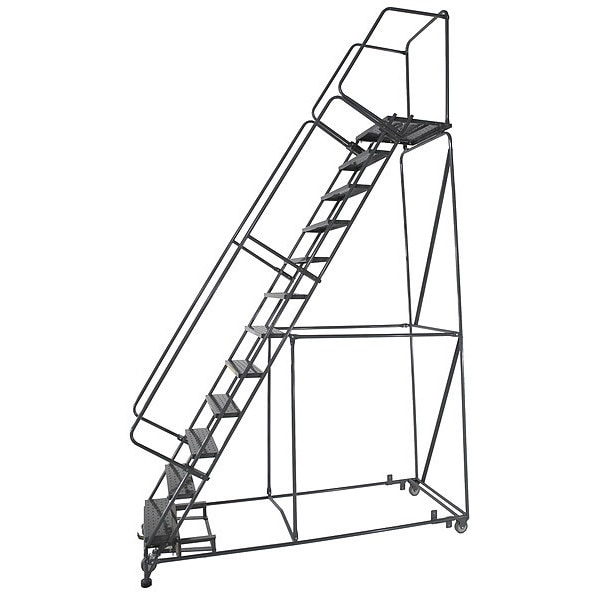 Rolling Ladder, Material Steel, Platform Height 11.7 ft, Handrails Included Yes, Handrail Height 3.5 ft, Overall Height 15.4 ft, Number of Steps 14, Unassembled, Load Capacity 450 lb, Step Tread Expanded Metal, Platform Depth 21 in, Platform Width 24 in, Bottom Width 40 in, Base Depth 107 in, Overall Width 40 in, Climbing Angle 59 Degrees , Step Depth 7 in, Step Width 24 in, Ladder Actuation Weight Activated Step Lock, Finish Powder Coated, Color Gray, Standards ANSI, OSHA Compliant