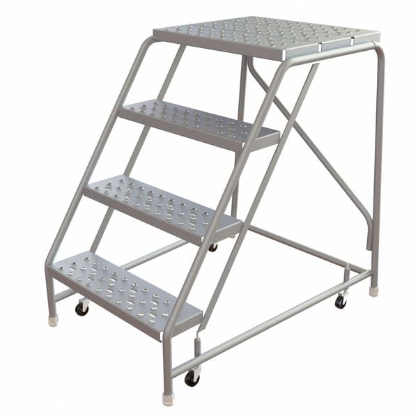 Rolling Ladder, Material Aluminum, Platform Height 3.3 ft, Handrails Included No, Handrail Height Not Applicable, Overall Height 3.3 ft, Number of Steps 4, Assembled, Load Capacity 350 lb, Step Tread Perforated, Platform Depth 21 in, Platform Width 24 in, Bottom Width 32 in, Base Depth 37 in, Climbing Angle 56 Degrees , Step Depth 7 in, Step Width 24 in, Ladder Actuation Spring Loaded Casters, Color Gray, Rear Exit No
