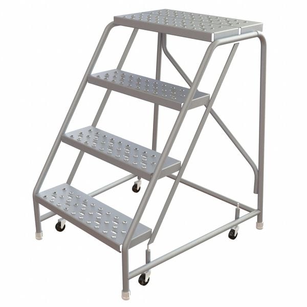 Rolling Ladder, Material Aluminum, Platform Height 3.3 ft, Handrails Included No, Handrail Height Not Applicable, Overall Height 3.3 ft, Number of Steps 4, Assembled, Load Capacity 350 lb, Step Tread Perforated, Platform Depth 14 in, Platform Width 24 in, Bottom Width 32 in, Base Depth 37 in, Climbing Angle 56 Degrees , Step Depth 7 in, Step Width 24 in, Ladder Actuation Spring Loaded Casters, Color Gray, Rear Exit No