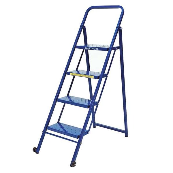 Folding Rolling Ladder, Material Steel, Platform Height 3.3 ft, Handrails Included No, Handrail Height Not Applicable, Overall Height 4.7 ft, Number of Steps 4, Assembled, Load Capacity 300 lb, Step Tread Perforated, Platform Depth 10 in, Platform Width 16 in, Bottom Width 21 in, Base Depth 39 in, Overall Width 21 in, Climbing Angle 59 Degrees , Step Depth 7 in, Step Width 16 in, Ladder Actuation None, Finish Powder Coated, Color Blue, Standards ANSI 14.7, OSHA Compliant