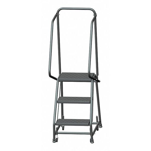 Rolling Ladder, Material Steel, Platform Height 2.4 ft, Handrails Included Yes, Handrail Height 2.5 ft, Overall Height 4.9 ft, Number of Steps 3, Unassembled, Load Capacity 450 lb, Step Tread Perforated, Platform Depth 10 in, Platform Width 16 in, Bottom Width 20 in, Base Depth 25 in, Overall Width 20 in, Climbing Angle 59 Degrees , Step Depth 7 in, Step Width 16 in, Ladder Actuation None, Finish Powder Coated, Color Gray, Standards ANSI, OSHA Compliant