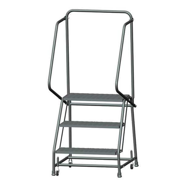Rolling Ladder, Material Steel, Platform Height 2.4 ft, Handrails Included Yes, Handrail Height 2.5 ft, Overall Height 4.9 ft, Number of Steps 3, Unassembled, Load Capacity 450 lb, Step Tread Expanded Metal, Platform Depth 10 in, Platform Width 24 in, Bottom Width 30 in, Base Depth 25 in, Overall Width 30 in, Climbing Angle 59 Degrees , Step Depth 7 in, Step Width 24 in, Ladder Actuation None, Finish Powder Coated, Color Gray, Standards ANSI, OSHA Compliant
