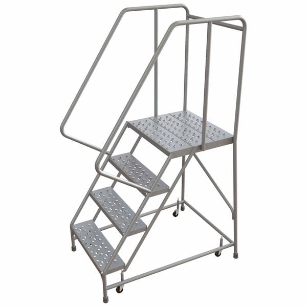 Rolling Ladder, Material Aluminum, Platform Height 3.3 ft, Handrails Included Yes, Handrail Height 2.5 ft, Overall Height 6 ft, Number of Steps 4, Assembled, Load Capacity 350 lb, Step Tread Perforated, Platform Depth 21 in, Platform Width 24 in, Bottom Width 32 in, Base Depth 37 in, Climbing Angle 56 Degrees , Step Depth 7 in, Step Width 24 in, Ladder Actuation Spring Loaded Casters, Color Gray, Rear Exit No