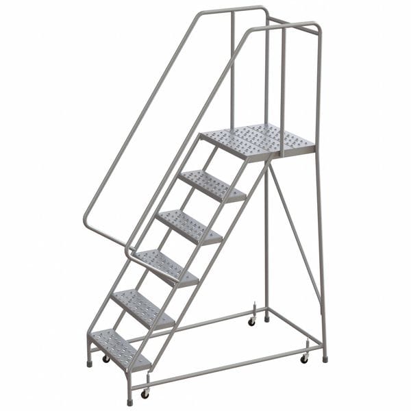 Rolling Ladder, Material Aluminum, Platform Height 5 ft, Handrails Included Yes, Handrail Height 2.5 ft, Overall Height 7.7 ft, Number of Steps 6, Assembled, Load Capacity 350 lb, Step Tread Perforated, Platform Depth 21 in, Platform Width 24 in, Bottom Width 32 in, Base Depth 51 in, Climbing Angle 56 Degrees , Step Depth 7 in, Step Width 24 in, Ladder Actuation Spring Loaded Casters, Color Gray, Rear Exit No