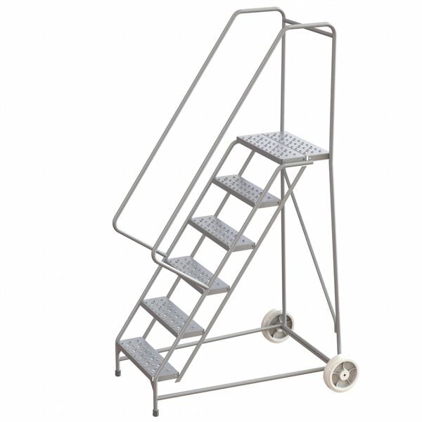 Wheelbarrow Ladder, Material Aluminum, Platform Height 5 ft, Handrails Included Yes, Handrail Height 2.5 ft, Overall Height 7.7 ft, Number of Steps 6, Assembled, Load Capacity 350 lb, Step Tread Perforated, Platform Depth 14 in, Platform Width 24 in, Bottom Width 37 in, Base Depth 55 1/2 in, Climbing Angle 56 Degrees , Step Depth 7 in, Step Width 24 in, Ladder Actuation Tilt and Roll, Color Gray, Rear Exit No