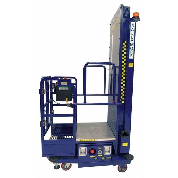 Mobile Personnel Lift, Drive Push-Around, Power Source Battery, Load Capacity 650 lb, Closed Height 7 ft 10 in, Max. Work Height 18 ft, Platform Extension 146 in, Outrigger Footprint L No Outriggers, Outrigger Footprint W No Outriggers, Overall Length 94 in, Overall Width 42 in, Platform Depth 17 in, Platform Width 29 in, Max. Platform Height 12 ft 2 in, Handrail Height 3.5 ft, Stowed Height 7.8 ft, Casters (2) Rigid, (2) Swivel, Caster Dia. 6 in, Ground Clearance 6 in, Batteries Included Yes