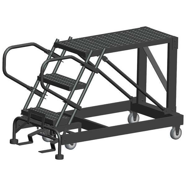 Single Access Rolling Platform, Material Steel, Platform Style Single Access, Platform Height 30 in, Load Capacity 800 lb, Base Depth 48 in, Bottom Width 33 in, Platform Depth 36 in, Platform Width 24 in, Overall Height 2 ft 6 in, Handrail Height Not Applicable, Number of Legs 2, Number of Steps 3, Step Width 24 in, Step Depth 7 in, Climbing Angle 59 Degrees , Step Tread Serrated, Color Gray, Finish Powder Coated, Standards ANSI, OSHA Compliant, Includes Lockstep and Push Rails
