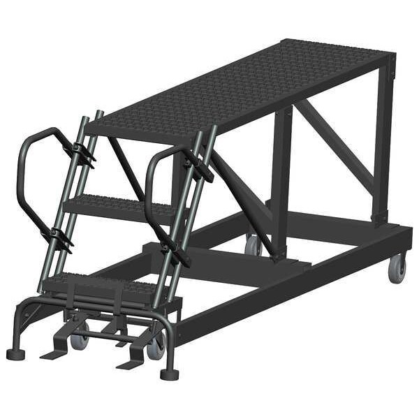Single Access Rolling Platform, Material Steel, Platform Style Single Access, Platform Height 30 in, Load Capacity 800 lb, Base Depth 84 in, Bottom Width 33 in, Platform Depth 72 in, Platform Width 24 in, Overall Height 2 ft 6 in, Handrail Height Not Applicable, Number of Legs 2, Number of Steps 3, Step Width 24 in, Step Depth 7 in, Climbing Angle 59 Degrees , Step Tread Serrated, Color Gray, Finish Powder Coated, Standards ANSI, OSHA Compliant, Includes Lockstep and Push Rails
