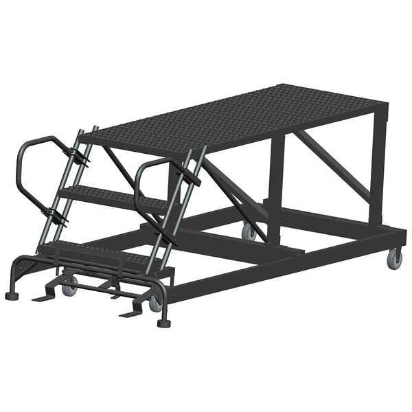 Single Access Rolling Platform, Material Steel, Platform Style Single Access, Platform Height 30 in, Load Capacity 800 lb, Base Depth 84 in, Bottom Width 38 in, Platform Depth 72 in, Platform Width 36 in, Overall Height 2 ft 6 in, Handrail Height Not Applicable, Number of Legs 2, Number of Steps 3, Step Width 36 in, Step Depth 7 in, Climbing Angle 59 Degrees , Step Tread Serrated, Color Gray, Finish Powder Coated, Standards ANSI, OSHA Compliant, Includes Lockstep and Push Rails