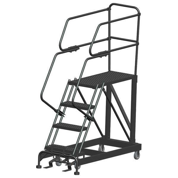Single Access Rolling Platform, Material Steel, Platform Style Single Access, Platform Height 40 in, Load Capacity 800 lb, Base Depth 54 in, Bottom Width 33 in, Platform Depth 36 in, Platform Width 24 in, Overall Height 6 ft 7 in, Handrail Height 3 ft, Number of Guard Rails 3, Number of Legs 2, Number of Steps 4, Step Width 24 in, Step Depth 7 in, Climbing Angle 59 Degrees , Step Tread Serrated, Color Gray, Finish Powder Coated, Standards ANSI, OSHA Compliant, Includes Lockstep and Handrails