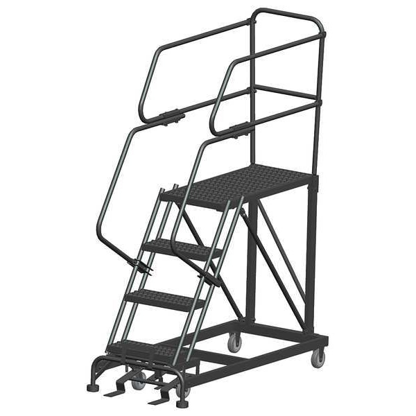 Single Access Rolling Platform, Material Steel, Platform Style Single Access, Platform Height 40 in, Load Capacity 800 lb, Base Depth 66 in, Bottom Width 33 in, Platform Depth 48 in, Platform Width 24 in, Overall Height 6 ft 7 in, Handrail Height 3 ft, Number of Guard Rails 3, Number of Legs 2, Number of Steps 4, Step Width 24 in, Step Depth 7 in, Climbing Angle 59 Degrees , Step Tread Serrated, Color Gray, Finish Powder Coated, Standards ANSI, OSHA Compliant, Includes Lockstep and Handrails