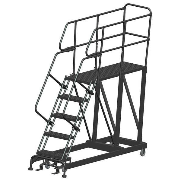 Single Access Rolling Platform, Material Steel, Platform Style Single Access, Platform Height 50 in, Load Capacity 800 lb, Base Depth 84 in, Bottom Width 33 in, Platform Depth 60 in, Platform Width 24 in, Overall Height 7 ft 5 in, Handrail Height 3 ft, Number of Guard Rails 3, Number of Legs 2, Number of Steps 5, Step Width 24 in, Step Depth 7 in, Climbing Angle 59 Degrees , Step Tread Serrated, Color Gray, Finish Powder Coated, Standards ANSI, OSHA Compliant, Includes Lockstep and Handrails
