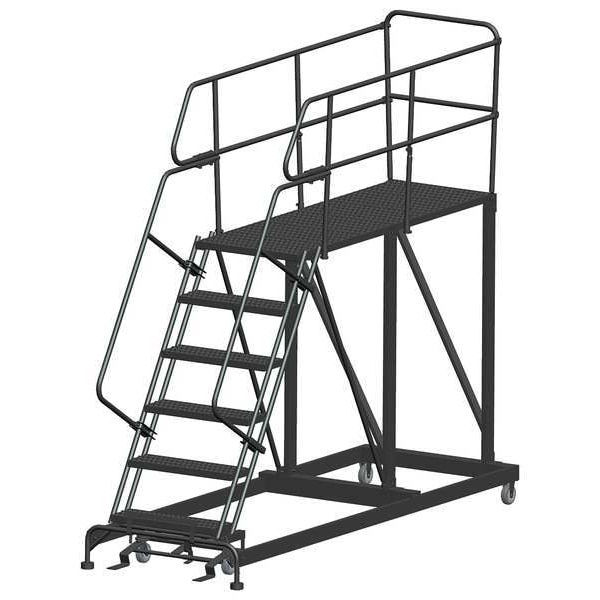 Single Access Rolling Platform, Material Steel, Platform Style Single Access, Platform Height 60 in, Load Capacity 800 lb, Base Depth 102 in, Bottom Width 38 in, Platform Depth 72 in, Platform Width 36 in, Overall Height 8 ft 3 in, Handrail Height 3 ft, Number of Guard Rails 3, Number of Legs 2, Number of Steps 6, Step Width 36 in, Step Depth 7 in, Climbing Angle 59 Degrees , Step Tread Serrated, Color Gray, Finish Powder Coated, Standards ANSI, OSHA Compliant, Includes Lockstep and Handrails