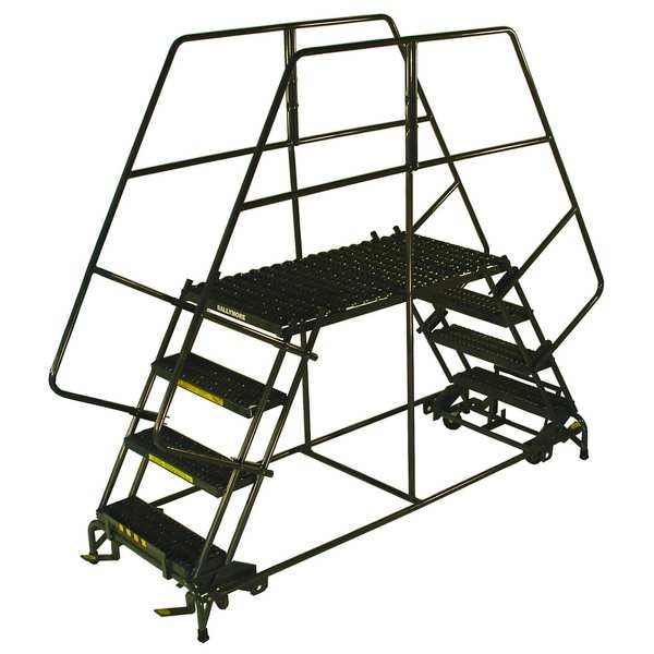 Dual Access Rolling Platform, Material Steel, Platform Style Dual Access, Platform Height 40 in, Load Capacity 800 lb, Base Depth 108 in, Bottom Width 38 in, Platform Depth 72 in, Platform Width 36 in, Overall Height 6 ft 4 in, Handrail Height 3 ft, Number of Guard Rails 4, Number of Legs 4, Number of Steps 4, Step Width 36 in, Step Depth 7 in, Climbing Angle 59 Degrees , Step Tread Serrated, Color Gray, Finish Painted, Standards ANSI, OSHA Compliant, Includes Top Step and Handrails