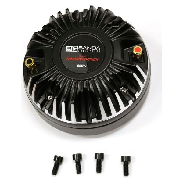 Titanium Diaphragm Compression Driver Die Cast Aluminum Frame with optimal heat dissapaiting design 2.0-in High Temperature KCCAW Voice Coil 35 Oz Heavy Duty Magnet structure 555 Watts Peak Power 8 0hm Impedance Sensitivity:110 dB Frequency response : 1000-18KHz Width: 13.5 CM x 6.2cm height Bolt hole diagonal to hole center: 102 mm Bolt hole to next bolt hole center: 72mm Speaker Facing diameter: 127mm Vocal center opening 2-in Quick Release Gold Color Alloy terminal connectors Two sets of bolts in the box: Black decorative and stud type with nuts and lock washers for extended length applications. Horn flares sold separately Fits Deejay LED horn flare models: TBH2INHORNBLUE, TBH2INHORNGOLD, TBH2INHORNGREEN, TBH2INHORNORANGE, TBH2INHORNRED