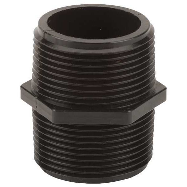 Hex Nipple, Polypropylene, Schedule 80, For Pipe Schedule Schedule 80, 1 1/4 in, Male, NPT, 11 1/2, 1 1/4 in, Male, NPT, 11 1/2, 2 in Overall Length, 300 psi Maximum Operating Pressure, -20 Degrees to 150 Degrees F