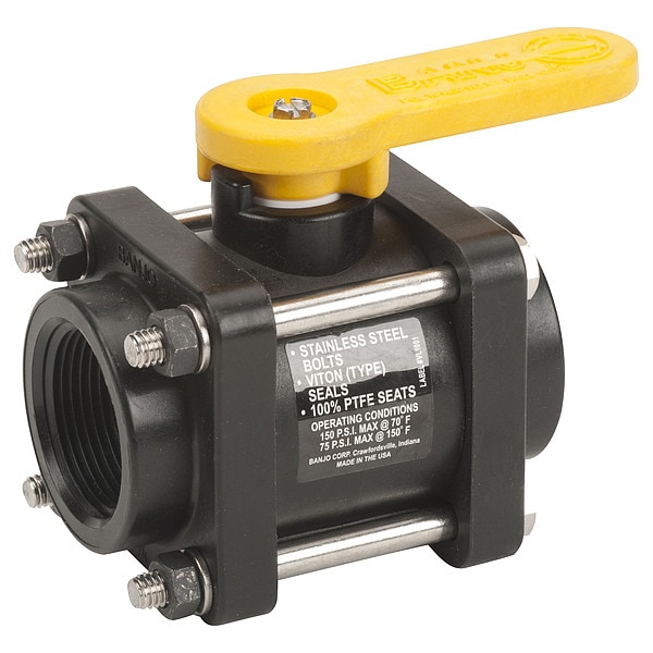 Manual Two-Way Ball Valve, Body Material Polypropylene, For Media Corrosive Chemicals, Water, Valve Construction Three-Piece, Nominal Valve Size 1 1/4 in, Valve Body Style Straight, 3-A Standard Compliance Not Rated, Average Surface Roughness (Ra) Not Applicable, Maximum Pressure - Operating 300 psi, Maximum Pressure - Steam Not Rated, Maximum Pressure - Combustible Gas Not Rated, Vacuum Service Rating Not Available, Ball Material Polypropylene, Ball Port Style Standard Port