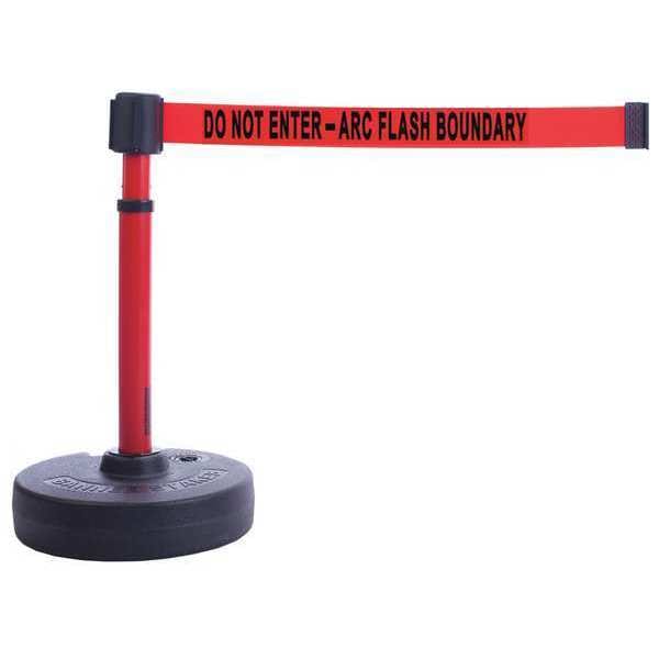 Barrier Post with Belt, Maximum Overall Height 42 in, Legend Do Not Enter - Arc Flash Boundary, Legend Color Black, Number of Belts 1, Belt Length 15 ft, Belt Width 3 1/2 in, Belt Color Red, Belt Pattern No Pattern, Post Color Red, Includes 15 ft Retractable Belt, Base, Minimum Overall Height 22 in, Post Material Plastic, Base Type Fillable with Water or Sand, Base Material Plastic, Resistance Properties Rust Resistant, Height Adjustability Adjustable Height