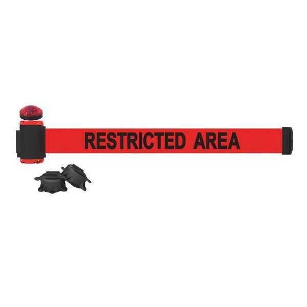 Belt Barrier w/Light Kit, Mounting Style Magnet, Suction Cup, Belt Length 7 ft, Belt Color Red, Legend Restricted Area, Frame Color Black/Red, Overall Height 6 3/4 in, Frame Finish Matte, Indoor/Outdoor Usage Indoor, Outdoor, Includes (2) Suction Cups, Light Kit with Red Strobe Light, Includes Mounting Hardware Included
