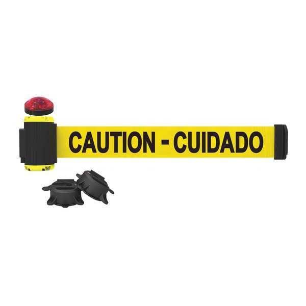 Belt Barrier w/Light Kit, Mounting Style Magnet, Suction Cup, Belt Length 7 ft, Belt Color Yellow, Legend Caution - Cuidado, Frame Color Yellow, Overall Height 6 3/4 in, Frame Finish Matte, Indoor/Outdoor Usage Indoor, Outdoor, Includes (2) Suction Cups, Light Kit with Red Strobe Light, Includes Mounting Hardware Included